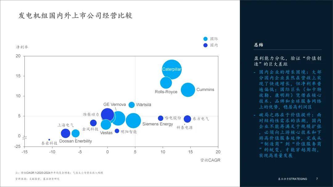 ▪ 成长性与规模:中国力量迅速崛起。从2020-2024年的复合年均增长率 (CAGR) 来看,中国企业表现亮眼。东方电气 (14.44%) 的增速与专注于高增长细分市场的康明斯 (14.54%) 并驾齐驱,远高于GE Vernova (1.91%) 、西门子能源 (4.67%) 等国际综合性巨头。这反映出中国企业正凭借本土庞大市场的驱动和积极的海外拓展,实现快速扩张。尽管在绝对收入规模上,卡特彼勒 (648亿美元) 、西门子能源 (386亿美元) 等依然领先,但中国龙头企业如潍柴动力 (292亿美元) 、东方电气 (93亿美元) 等正在迅速缩小差距。