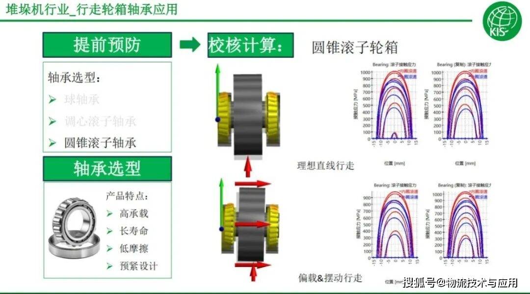 KIS通过专业的应用分析软件,以及应用工程师经验,可以帮助客户去做最小型、最优的轴承的选择。如,通过线形图可以分析哪些滚动体受力、有几个滚动体受力、每个滚动体表面的应力是多少?从而选择最合适的轴承。在实际使用过程中,调心轮箱会分为固定端和浮动端,浮动端可以随着受力达到均衡受力,但固定端有可能会出现力的偏载,可以通过演算模拟来选择轴承,从而达到比较稳定的状态。具体到轮箱轴承的选型,有球轴承、调心轴承、圆锥轴承等等,根据不同的速度和承载来进行针对性选择。也就是轴承特性的不同,决定着在不同工况下应该选择什么样的产品。