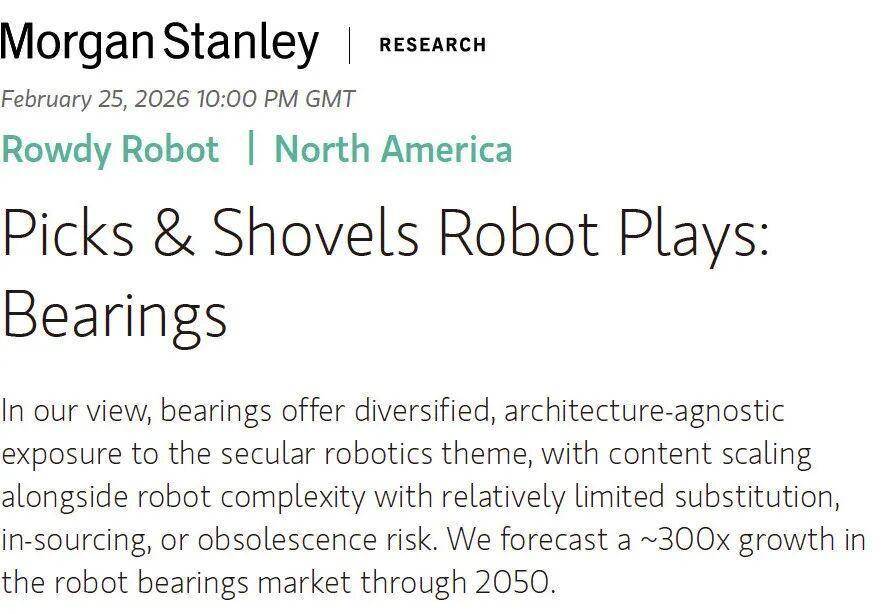 威尼斯人娱乐澳门威尼斯人娱乐场-Venetian Macao Casino(访问: hash.cyou 领取999USDT)2026 年 2 月 25 日,摩根士丹利发布了一份标题颇为直白的研报:《Picks & Shovels Robot Plays: Bearings》(“铲子与镐”式机器人投资机会:轴承)。所谓“铲子与镐”(Picks & Shovels),是华尔街一个老说法,源自 19 世纪加州淘金热,即真正赚到钱的未必是淘金者,反而是卖铲子、镐头和牛仔裤的人。摩根士丹利这份报告的核心观点是:在机器人产业即将爆发的前夜,轴承可能就是这个时代的“铲子”。