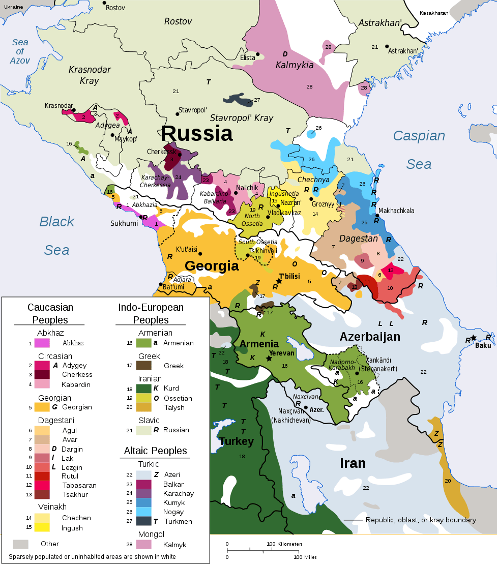 整个高加索地区的现有人口——约 3900 万至 4000 万——可根据语言和民族特征进行三重分类。高加索语系包括在俄罗斯北高加索和格鲁吉亚地区盛行的语言。最重要的印欧语系语言包括亚美尼亚语(拥有自己的文字),分布于亚美尼亚共和国和阿塞拜疆纳戈尔诺-卡拉巴赫省,以及由北高加索、第比利斯和巴库的俄罗斯族人使用的俄语。第三类是讲土耳其语的人群,分布在阿塞拜疆、达吉斯坦及其他地区。这些地区的宗教结构与民族和语言划分不符。东正教徒主要分布在格鲁吉亚和北高加索地区。亚美尼亚人和奥塞梯人也是基督教徒占多数的民族,而大多数阿塞拜疆人是什叶派;北高加索地区则是逊尼派。德尔本特、兹钦瓦利、第比利斯、巴库和库巴等城市拥有规模可观的犹太社区。