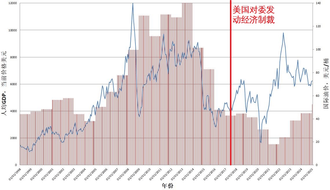 “工业化产油时代”到来后的几十年里,埃克斯-美孚和壳牌等英美石油公司蜂拥来到这个国家;到1935年,美国在委内瑞拉的石油领域基础投资,已占其全部海外石油总投资的40%。开采活动带来了烈火烹油、鲜花着锦的纸面繁荣,据一些右翼倾向的非正规统计平台用未知基准汇率折算成当代美元的数据,1950年,委内瑞拉人均GDP仅次于美国、瑞士和新西兰,一度是“世界第四富裕”的国家;实际上,这种“折算”更多是一种反查韦斯-马杜罗叙事的“带节奏”,但当时及之后很长时间,委内瑞拉官方统计的人均GDP确实稳定在至少世界前二十名水平。